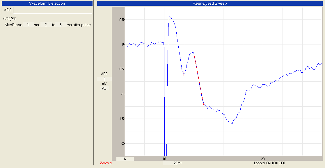 To use the Maximum Slope, you set the MaxSlope time field ("1 ms" in the figure below) so that it is smaller than the BegTime/EndTime range ("2 to 8 ms after pulse" = 6 ms). The 1 ms MaxSlope (marked by the red line) lies within the 6 ms BegTime/EndTime range (marked by solid vertical lines on the trace).